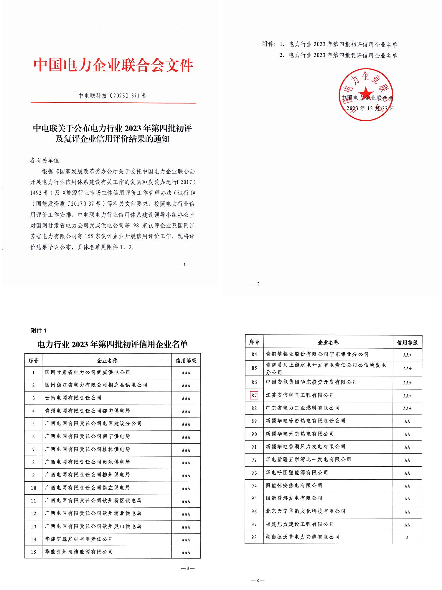 近日,根據(jù)國家發(fā)改委關于開展電力行業(yè)信用體系建設以及能源行業(yè)市場主體信用評價工作管理辦法,中國電力企業(yè)聯(lián)合會公布了一批評價結果,公司初評獲得信用等級AA+企業(yè)的稱號。公司秉承“安全、誠信、創(chuàng)新、共贏”的服務理念,高度重視企業(yè)信用體系建設,專門成立了信用體系建…
