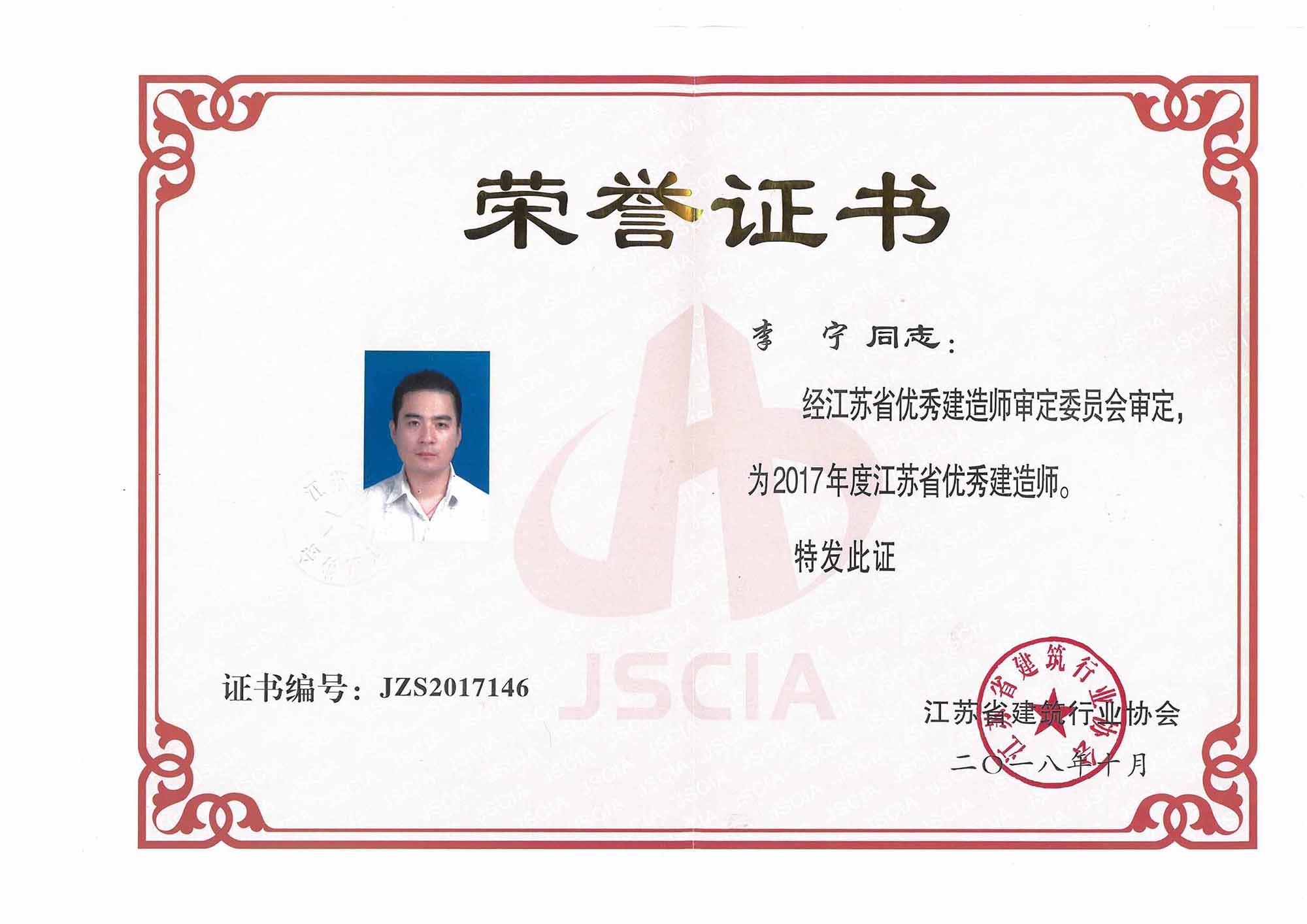 二0一八年十月,我公司優(yōu)秀員工李寧同志喜獲江蘇省建筑行業(yè)協(xié)會頒發(fā)的“2017年度江蘇省優(yōu)秀建造師”稱號!
