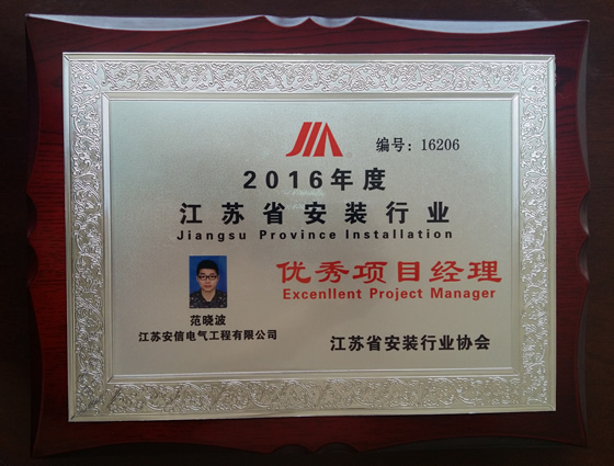 熱烈祝賀我公司范曉波同志被評為2016年度江蘇安裝行業(yè)“優(yōu)秀項目經(jīng)理”稱號