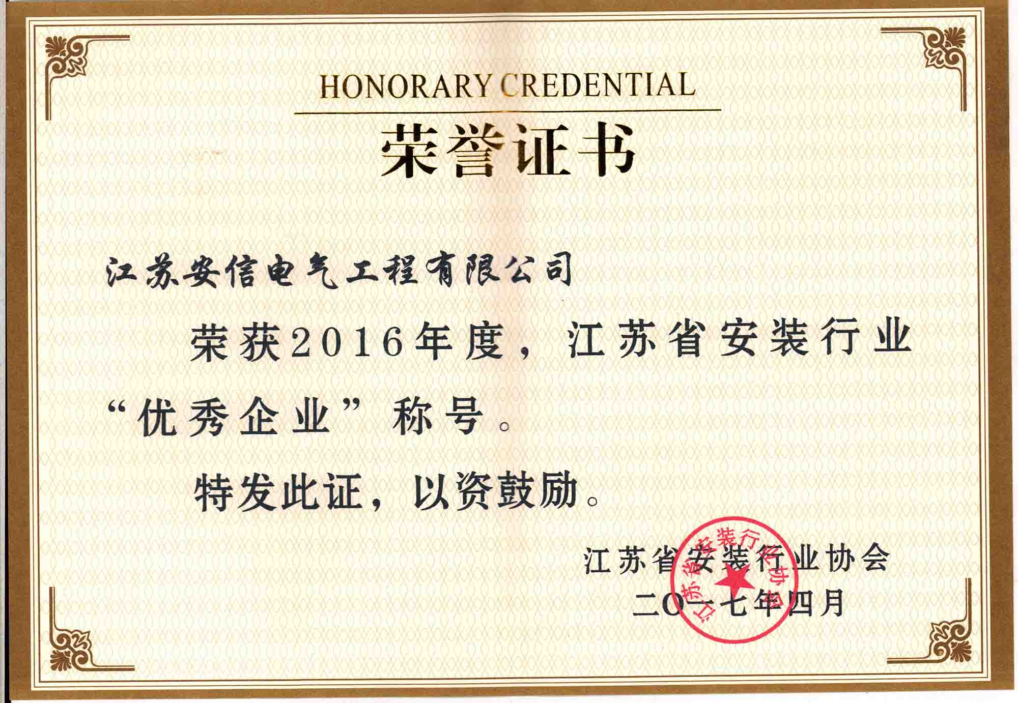 ? ? 2017年4月,我公司獲江蘇省安裝行業(yè)協(xié)會頒發(fā)的——2016年度江蘇省安裝行業(yè)“優(yōu)秀企業(yè)”稱號。