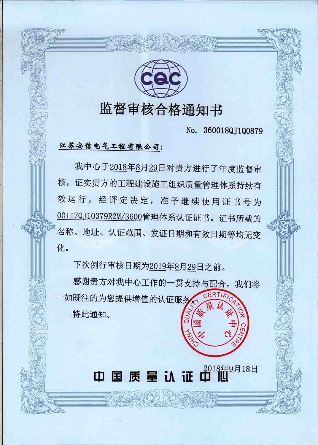 2018年9月,我公司又一次通過了質(zhì)量管理體系、環(huán)境管理體系及職業(yè)健康管理體系,三體系認(rèn)證年審。我公司將繼續(xù)緊守三體系標(biāo)準(zhǔn)要求,嚴(yán)格要求自已,繼續(xù)一如既往提高建設(shè)工程質(zhì)量水平,重視環(huán)境管理,關(guān)注員工職業(yè)健康,保持我公司持續(xù)穩(wěn)健地發(fā)展,為國家電網(wǎng)建設(shè)作出更大貢獻…