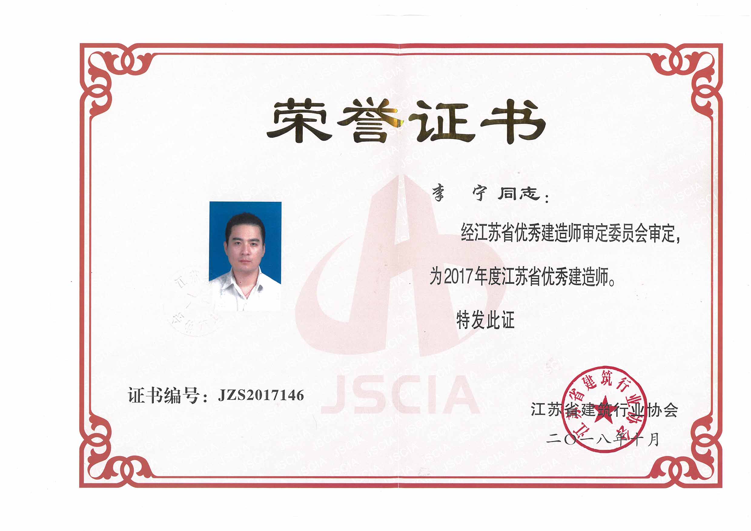 二0一八年十月,我公司優(yōu)秀員工李寧同志喜獲江蘇省建筑行業(yè)協(xié)會頒發(fā)的“2017年度江蘇省優(yōu)秀建造師”稱號!